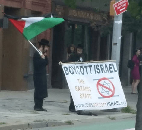 But the crowning jewel in Hamas’ arsenal, a weapon so powerful it managed to drag me out of my silence and back onto my blog, is far and away the Niturei Karta (Lit. Guardians of the City; They are of the belief that the State of Israel has no right to exist until the Messiah comes and establishes it). I’ve read about them in news articles and magazines, and seen pictures of their infamous meetings with terror leaders in Palestine and Iran, but it was different seeing them up close, on my turf. I was driving by the UN, stopped at a stop sign, looked out of my window to the left, and there they were by the Sharansky Steps, two chassidim (Hassidic Jews), one waving a Palestinian flag, and the other a sign beseeching people to boycott the “Satanic” State of Israel.