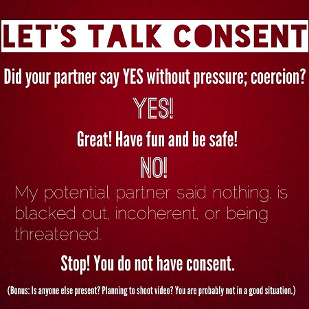 A perfect example of this is “No Means No.” No Means No was meant to raise awareness of rape on college campuses, and set a standard by which rape could be reduced: If you hear no, stop. Don’t ask again, don’t “just finish,” don’t back off and then start again—just stop. At the time—back in the eighties—it seemed like a good idea. Recently, however, there has been a push to redefine the way we view consent. The problem with No Means No, is that it places the onus on the woman to say no, rather than on the man to receive consent. Therefore, consent is not an affirmative process, just a tacit understanding until the woman says “no.” It’s kind of ironic how a slogan meant to fight rape culture instead promoted it by—almost certainly unintentionally—implying that one is entitled to sex without receiving prior affirmative consent, as long as they believe they have consent.